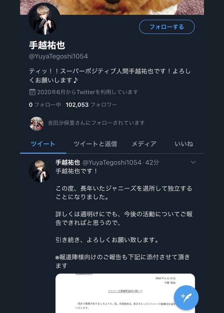 ジャニーズ事務所を退所した手越祐也さん、光の速さでTwitterアカウントを開設してしまうwww